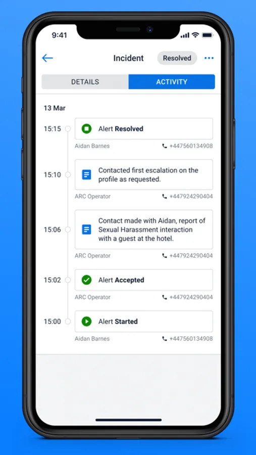 - Phone dialer access to automatically call alert contacts when raising alerts