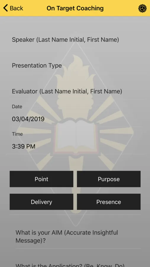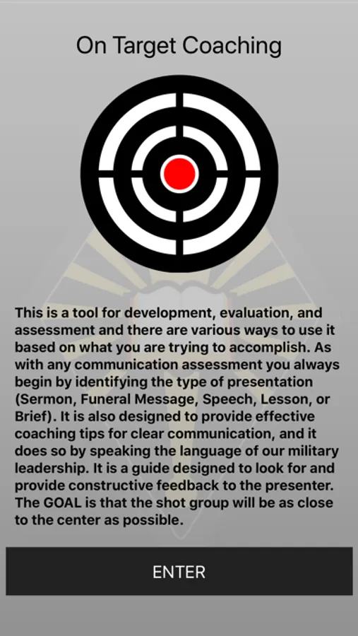The On Target Coaching presentation application is a mobile tool for coaching, development, evaluation, and assessment of sermons, funeral messages, speeches, lessons or briefs. As with any communication assessment the main focus is on improving future performance through effective coaching and feedback.
