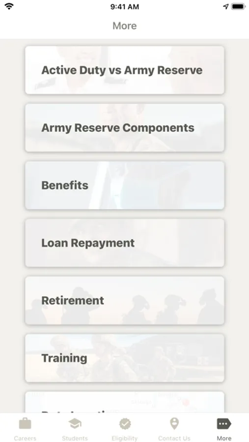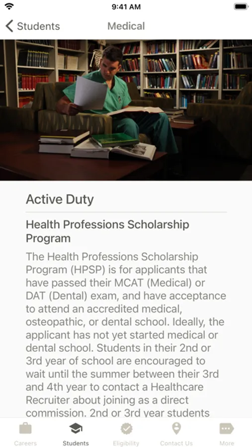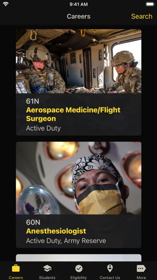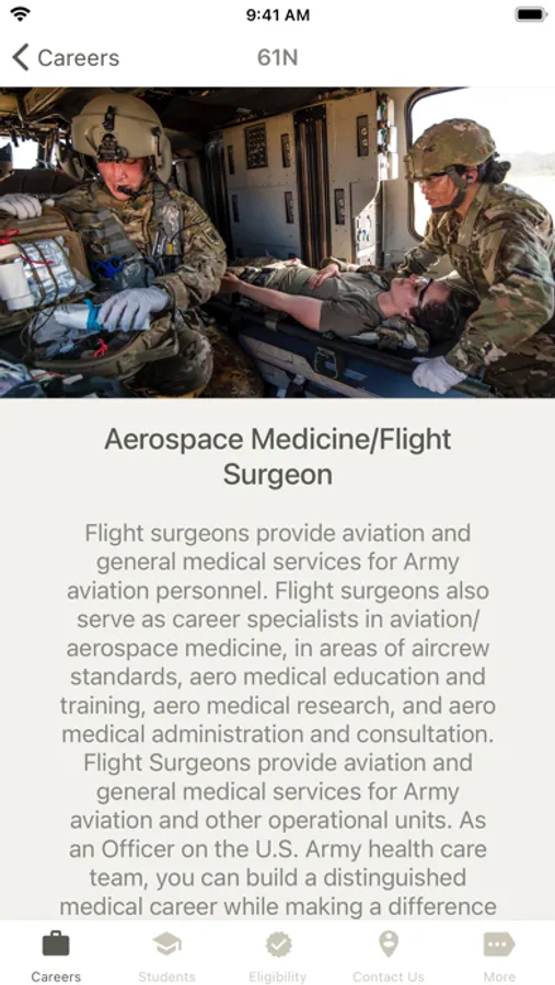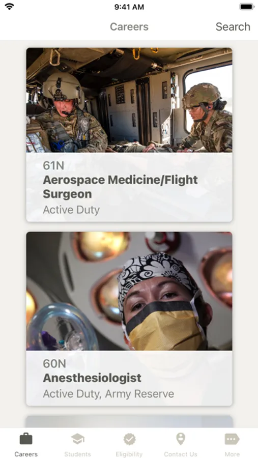 With U.S. Army Medicine Careers, you can find out about current career opportunities, check your eligibility, and get in touch with a Healthcare Recruiter. Students can browse scholarship programs, and individuals unfamiliar with the U.S. Army can find out about multiple ways to serve. And you can do it all from the comfort of your home!
