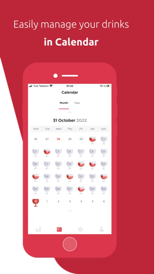 With Alcohol Drink Calendar you can easily mark and track days when you had a sudden glass of wine or pine of beer.