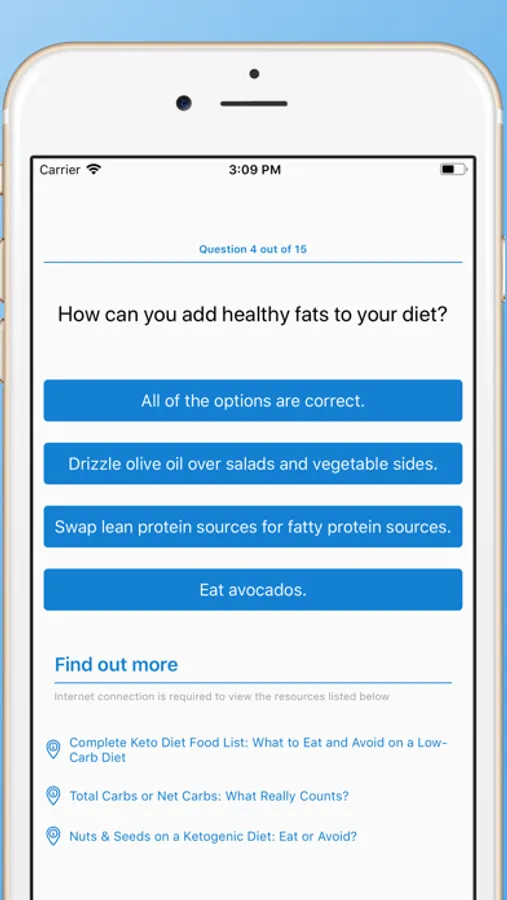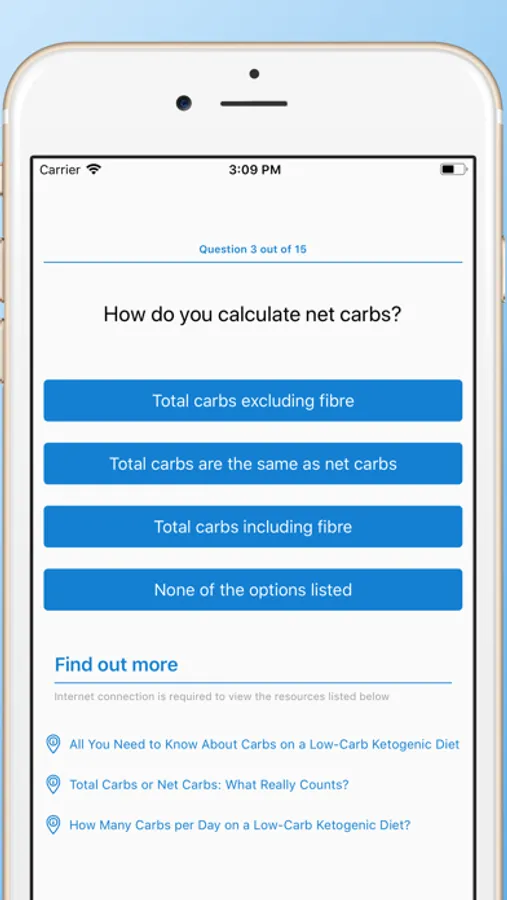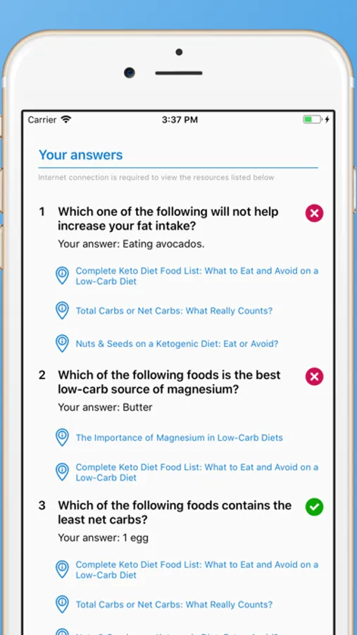 The quiz contains thousands of questions from various categories & difficulty levels. Each game you play consists of 15 random questions of increasing difficulty levels. At the end of each game you can see a summary of your answers and relevant online resources for each quiz question. You can share your score with your friends and challenge them to take the keto diet quiz.