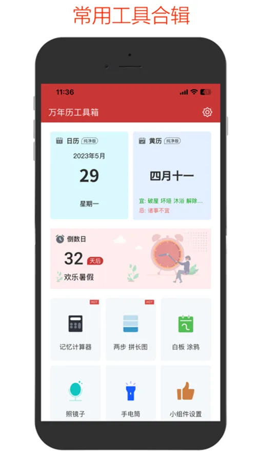 2.目前已包含工具:万年历日历、黄历、倒数日、计算器、拼长图、白板、照镜子、手电筒。