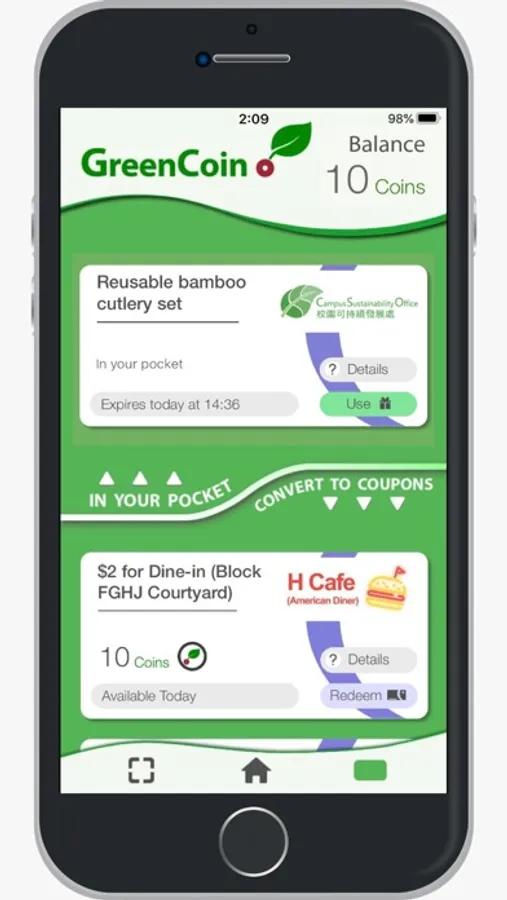 GreenCoin is a brand new campaign on campus that empowers and rewards your actions towards sustainability! Staying green and taking part in selected sustainability activities will enable you to accumulate Coins via your mobile phone, and the Coins can be redeemed for gifts and e-coupons that you can use at facilities on campus!