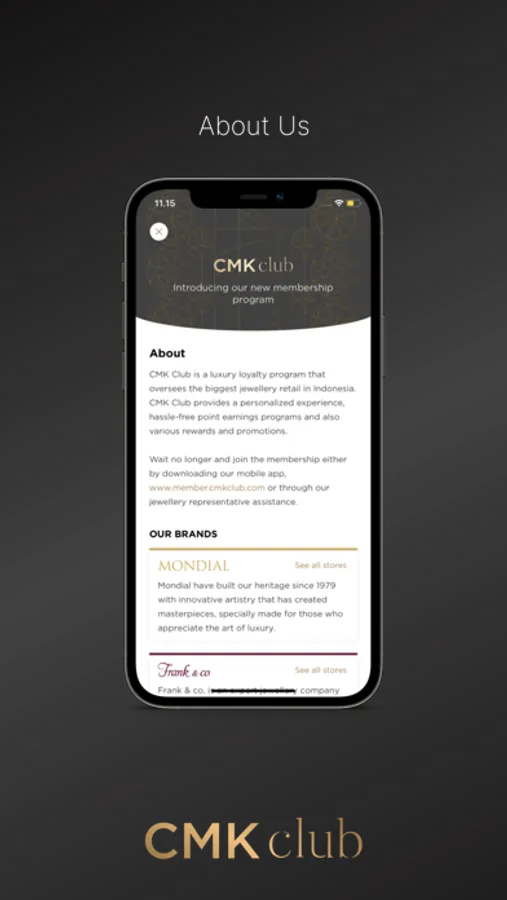 CMK Club is a loyalty program from PT. Central Mega Kencana that provides multiple reward & benefits for Mondial, Frank & co., Miss Mondial & The Palace customers.CMK Club mobile application will give you an information about our unique jewellery collection, special promotion, your membership tiering, loyalty points, exclusive rewards and many more.Download & register now! Enjoy your CMK Club privilege provided by Mondial, Frank & co., Miss Mondial & The Palace