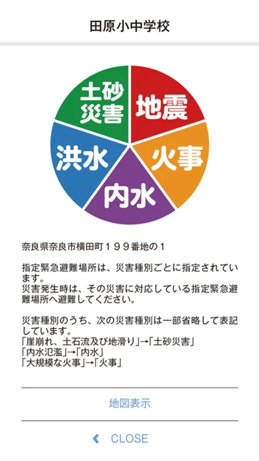 詳しくは、「ここから近くの指定緊急避難所」メニュー画面の【「ここから近くの指定緊急避難場所」の使い方】をタップしてください。