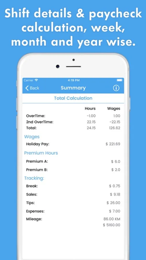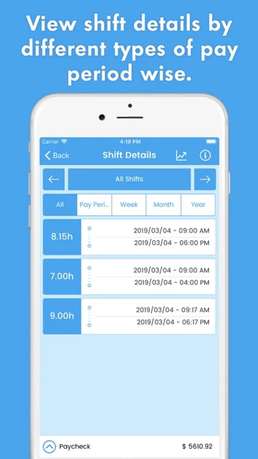 • Shows shift details and paycheck calculation all, pay period wise, week wise, month wise, and year wise.