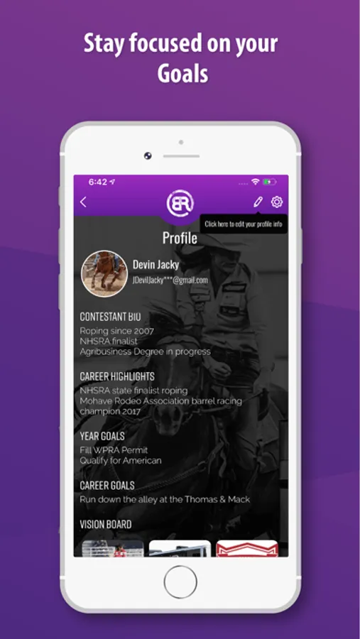 • Not only can you work on your bio for when the WPRA needs it for the NFR program, you can upload photos of membership cards and monitor your earnings by season and career. We've also created a space for you to input short and long term goals and create a vision board. Tap here often to stay inspired and always moving toward achieving your dreams. You've got this and we've got you!