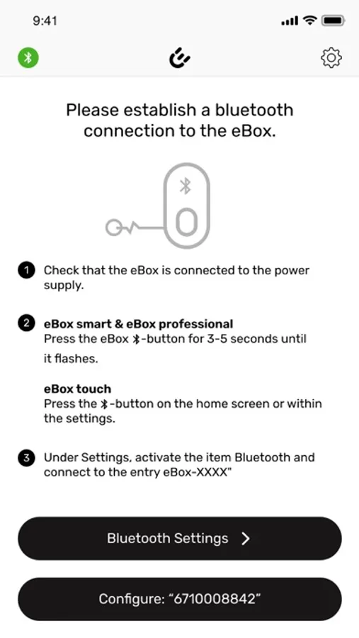 Commissioning of an intelligent charging box has never been as easy as it is with the eConfig app. In order to connect with app and eBox securely, the installer simply has to connect with the bluetooth interface of the eBox.