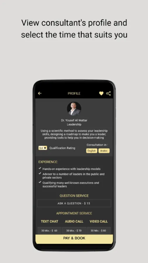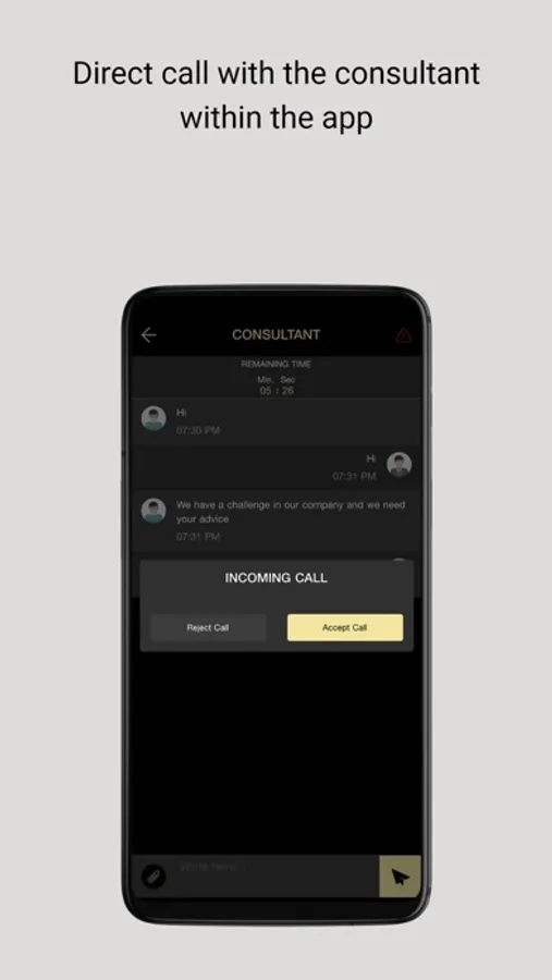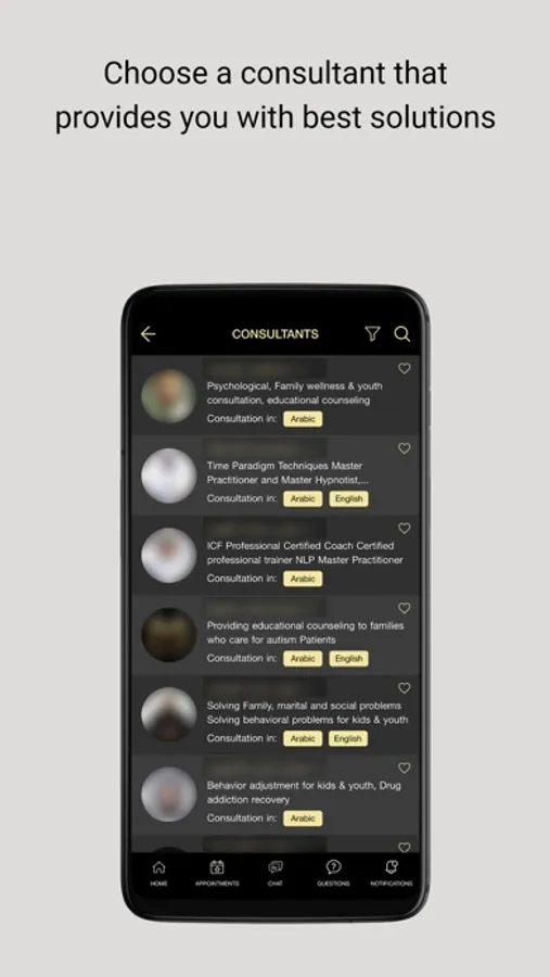 As we seek to simplify the consultation service, we offer you an application that enables you to communicate with a well selected group of specialized consultants from all over the world, in numerous fields, at the moment in time that suits you, via direct call, written text chat, or by audio recorded messages.