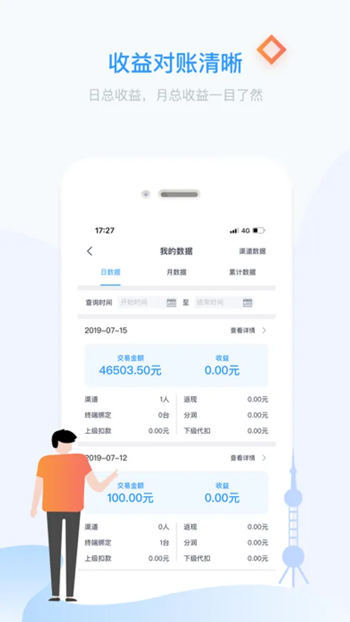 收益:实时显示日汇总、月汇总、累计数据,按天查询对账、图表展示。