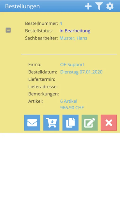 Mit OF-Order können Sie einfach und schnell Ihr Material bei Ihren bevorzugten Lieferanten bestellen. Im Unterschied zu den von vielen Lieferanten zur Verfügung gestellten ähnlichen Apps sind Sie bei OF-Order bei Ihren Bestellungen nicht an den Lieferanten gebunden.