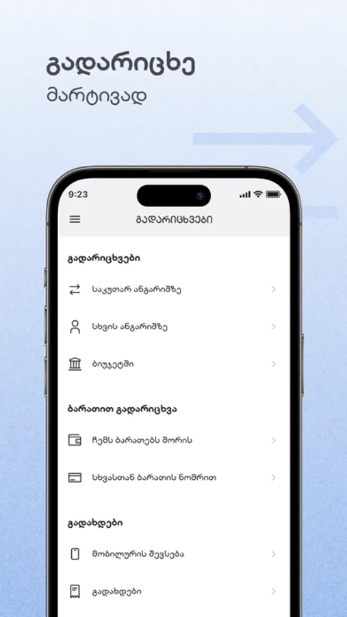 - Instantly transfer funds across own accounts, deposits or credit cards.