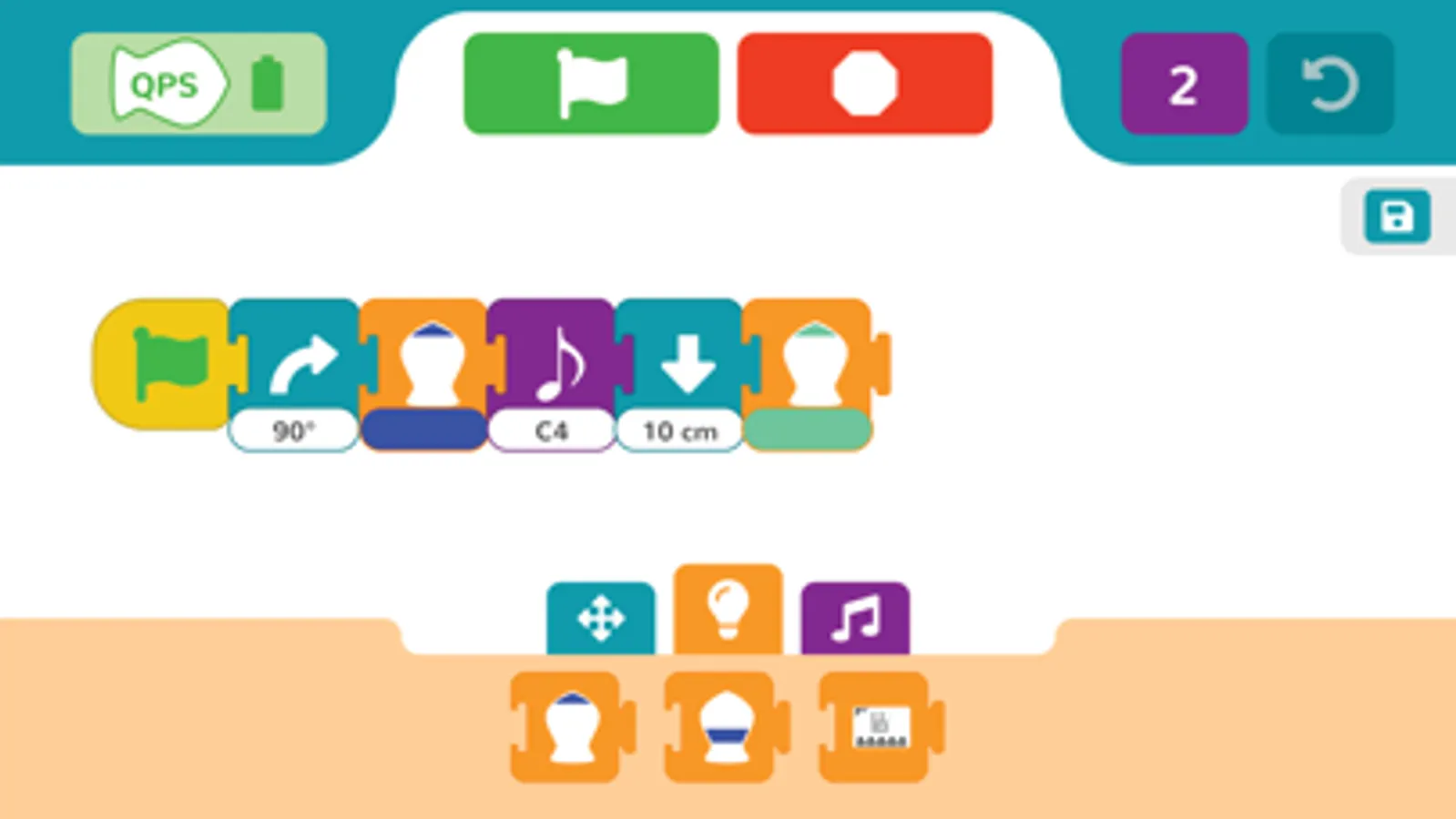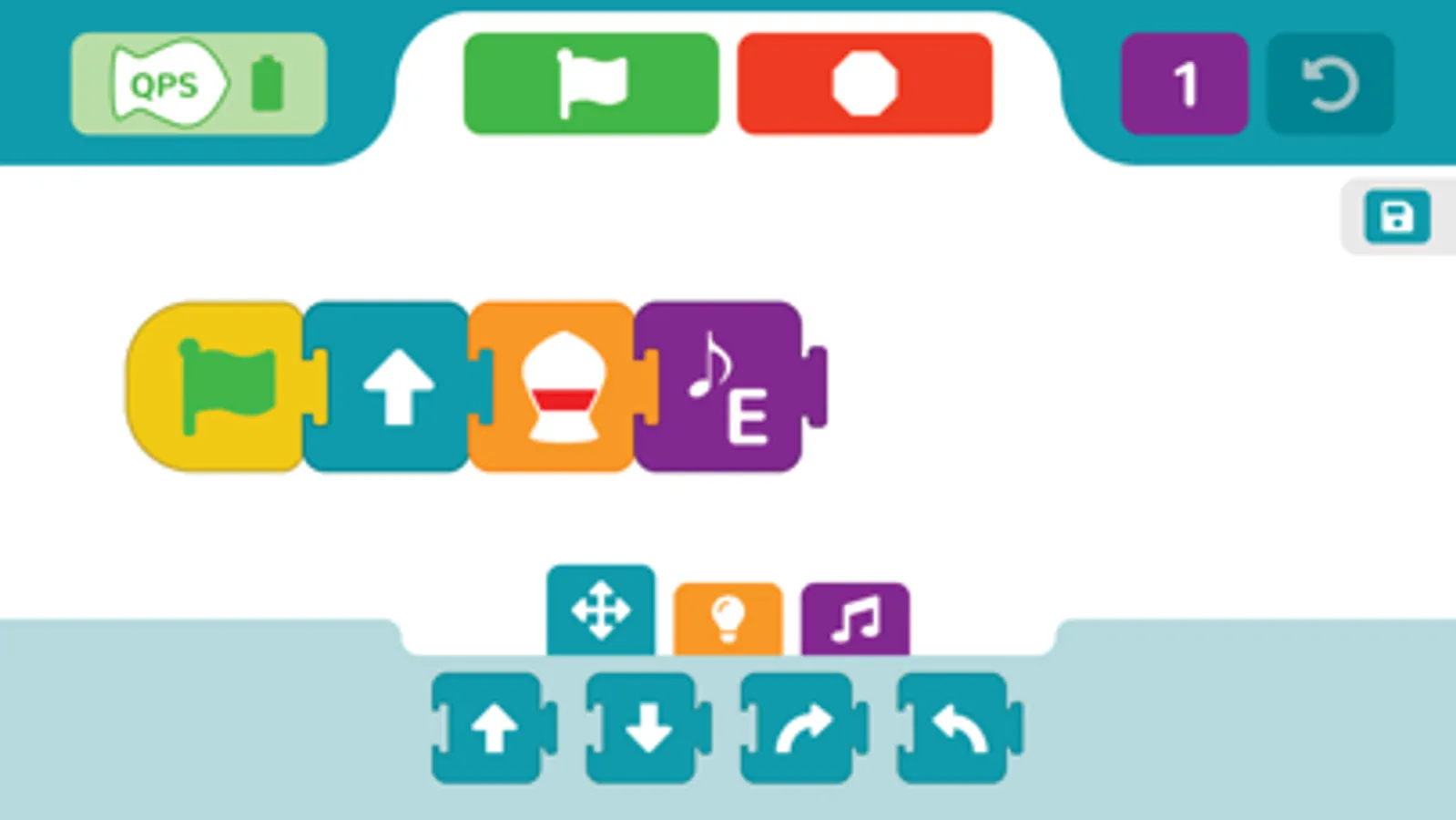 Level 1 introduces sequencing. For example, children connect blocks to make the robot move forward, beep, and then turn left.