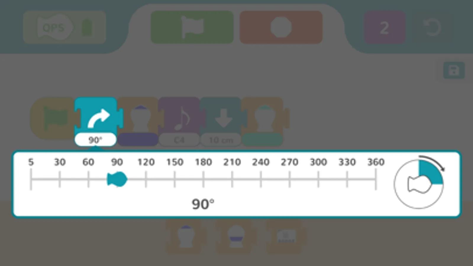 Level 2 introduces parameters by providing sliders that children can use to adjust what each block does. For example, a slider in the turning block adjusts how far the Finch turns.