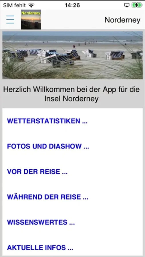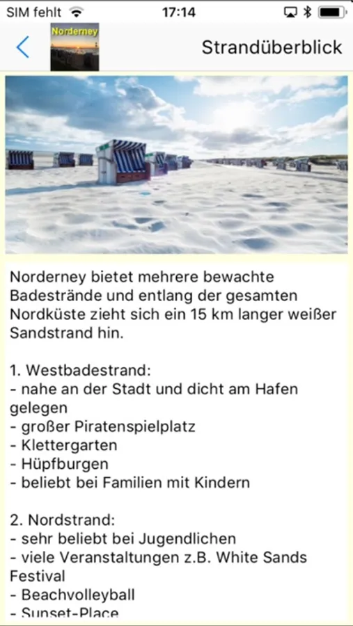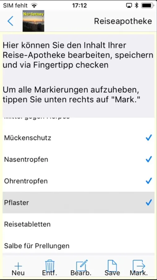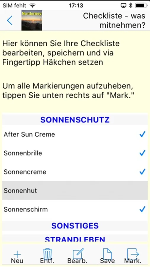 Die Norderney-App und enthält u.a. Reise-Checklisten für Ihre Reiseapotheke und Ihr Urlaubsgepäck, welche Sie auch selber verfeinern und im nächsten Urlaub wieder benutzen können. Außerdem bietet sie eine Reistagebuch und Wetterstatistiken mit schönen Diagrammen z.B. zum Klimavergleich zweier Urlaubsort. Weiterhin ist eine kleine Diashow und eine Sammlung von relevanten Webseiten für die Region vorhanden und gibt Ihnen die Möglichkeit, alle Informationen, die für Ihren Aufenthalt auf Usedom oder für Sie als Fan von Usedom interessant sind, möglichst bequem im Internet abzurufen: