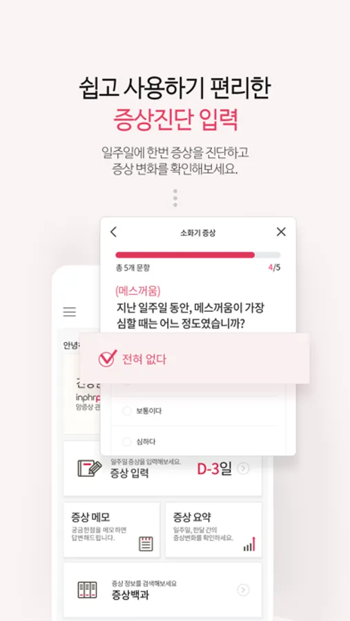 - 증상 입력 : 카테고리 별로 설문을 통해 현재 증상에 대해 기록 할 수 있습니다.