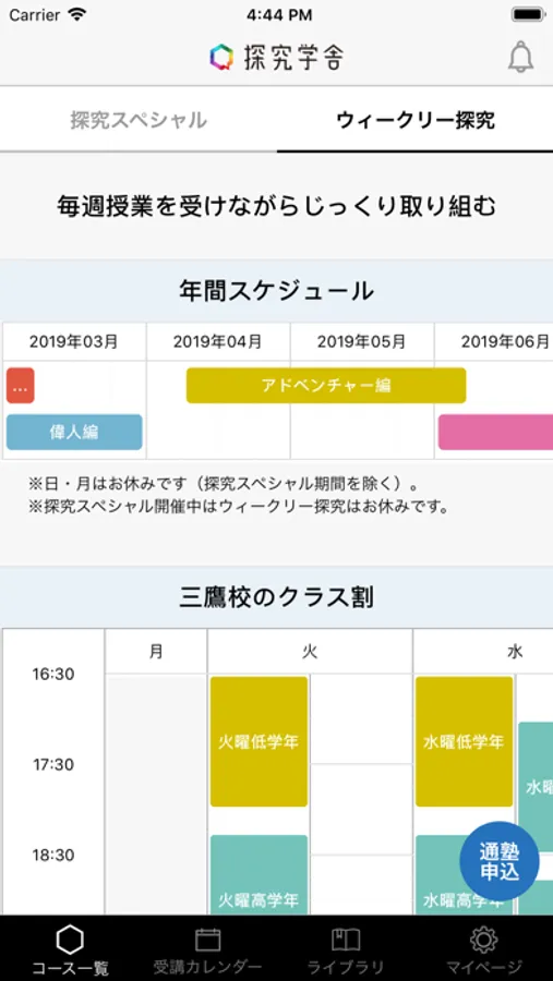 -「ウィークリー探究」の年間スケジュール、クラスの確認、入塾申込。