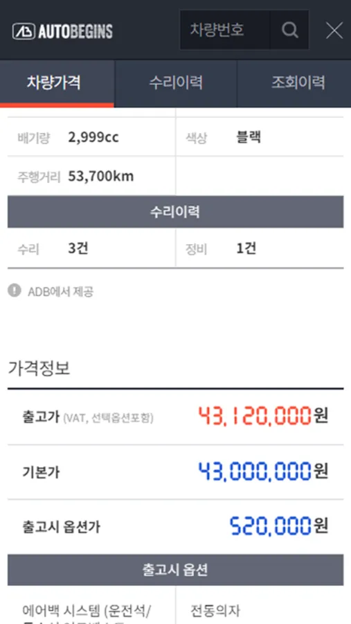차량번호 입력만으로 출고정보, 신차 제원, 중고차시세, 감가율, 수리/정비 이력 등을 확인 할 수 있습니다.