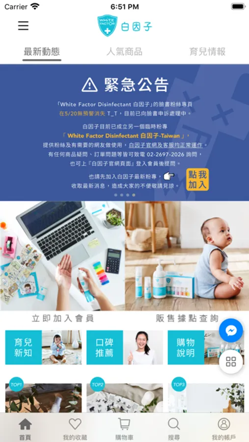 掌握最新健康防疫及購買資訊,快下載白因子消毒抗菌專屬APP。即時推播最新活動及優惠訊息,讓你健康不漏接。