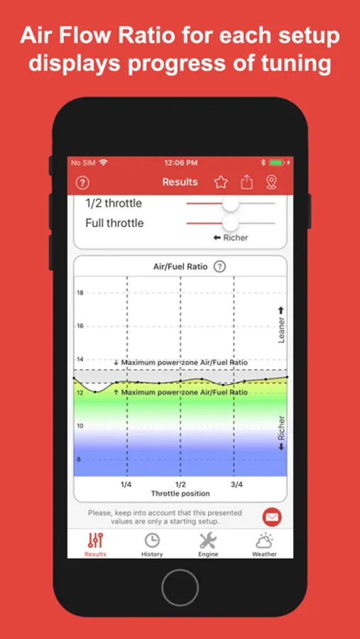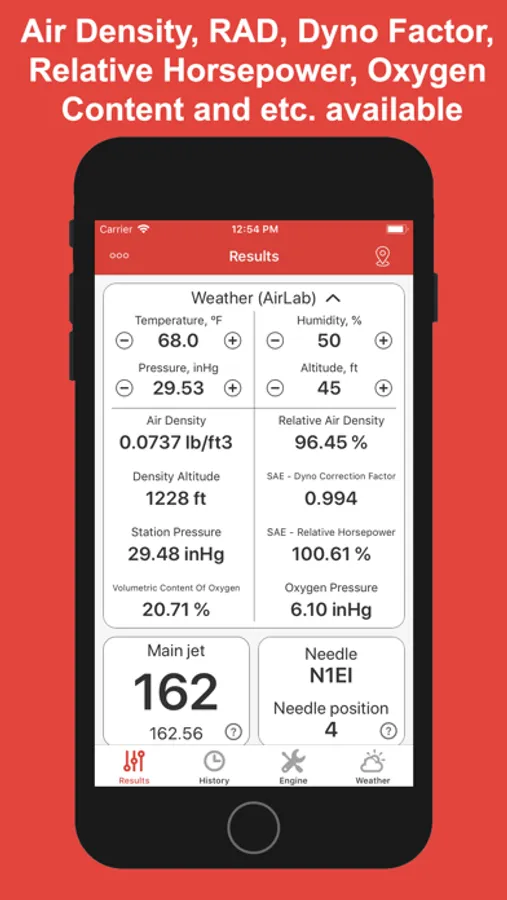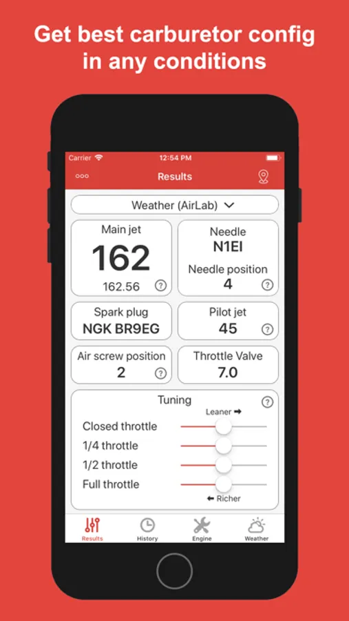 • Results: In this tab main jet, needle type, needle position, pilot jet, air screw position, throttle valve, spark plug are shown. These data are calculated depending on the weather conditions and the engine configuration given in the next tabs.