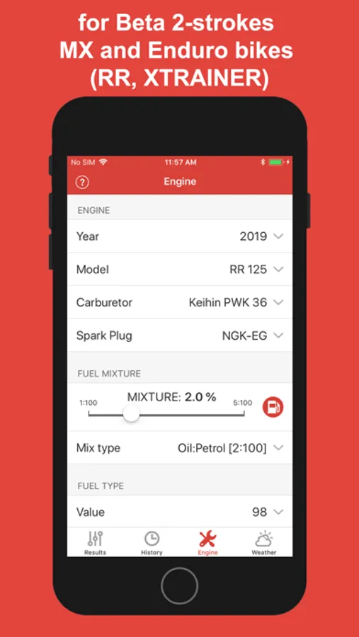 This app is using temperature, altitude, humidity, atmospheric pressure and your engine configuration for calculate optimal jetting (carburetor configuration) and spark plug to use for Beta 2-strokes Enduro, MX moto bikes.