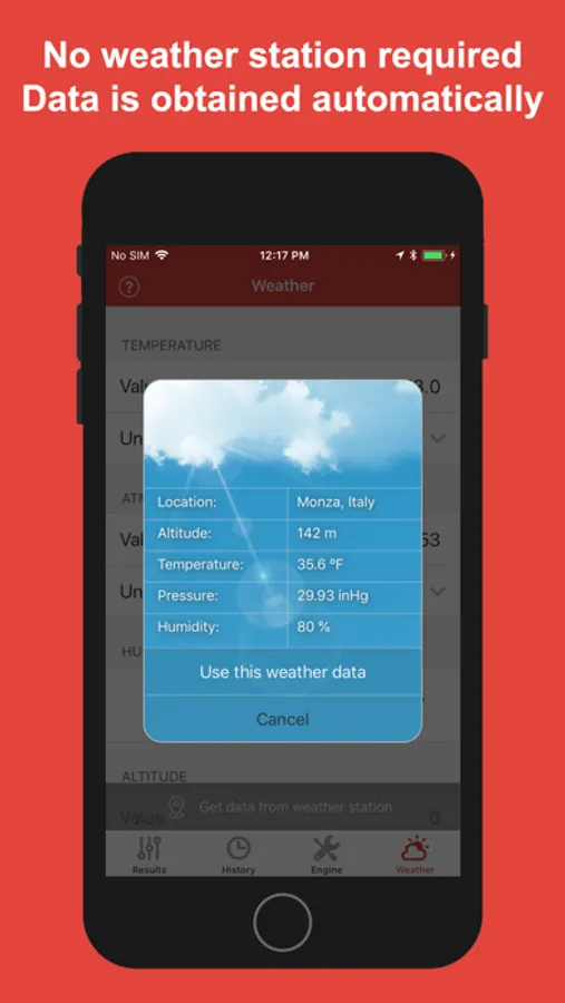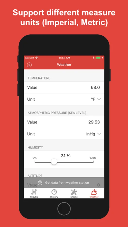This app can obtain automatically the position and altitude to get the temperature, pressure and humidity from the nearest weather station thought internet. Internal barometer is used on supported devices for better precision. If more accuracy is needed, a portable weather station can also be used. Application can run without GPS, WiFi and internet, in this case user has to give the weather data manually.