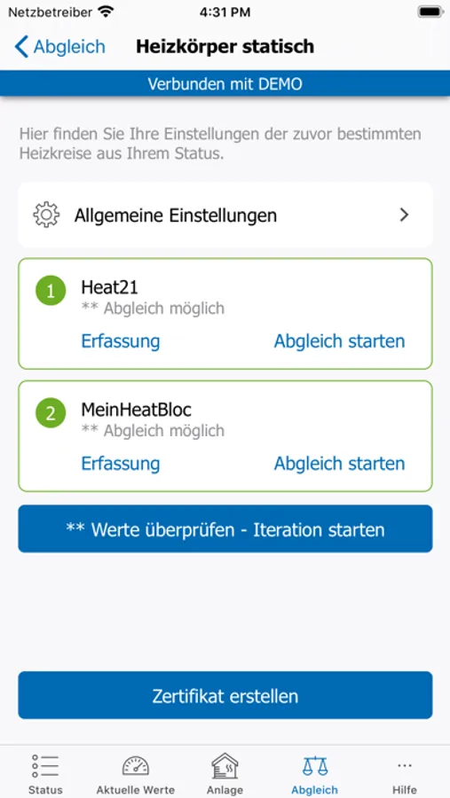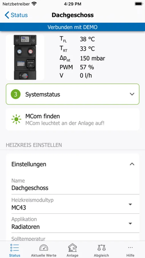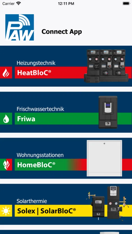 Note: The integrated demonstration function allows to test the majority of the range of functions. For the complete use of the app, a connection to a PAW HeatBloC® MC system with communication set 3 (item no. 1398731) is necessary. If necessary, the WLAN range can be enlarged by means of a PowerLine set (item no. 1398736) within the building.