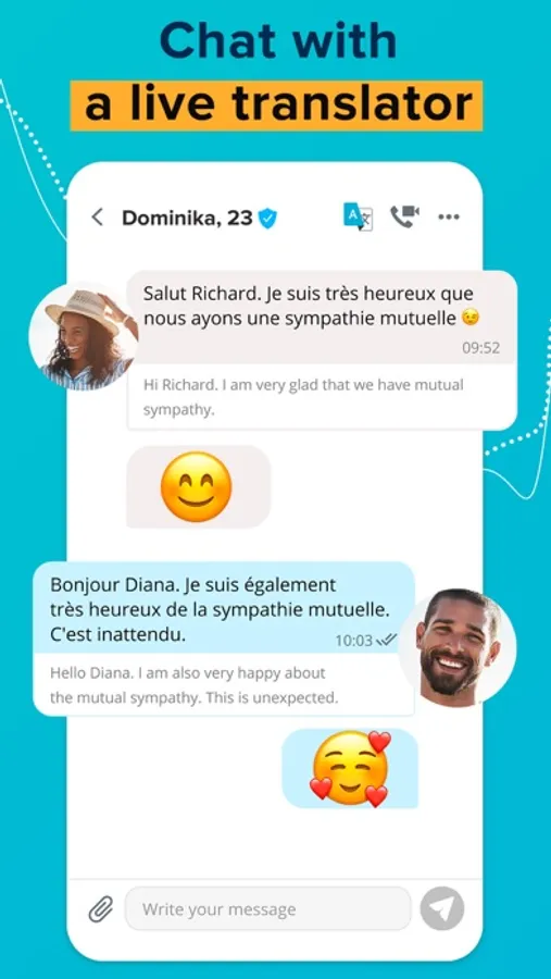 Chat in over 100 languages. No more wasting time on a translator. Your sent and received messages will be automatically translated into the right language.
