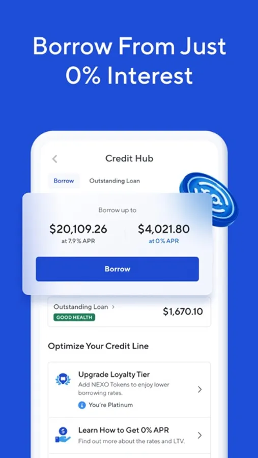 With Nexo’s Instant Crypto Credit Lines, you can borrow stablecoins, USD, EUR, GBP, and 40+ other fiat currencies against your crypto without selling it. Borrowing rates start from 0% interest and you get the funds within 24 hours in most cases. Get complete control over your loan's health at all times. Pay off your balance partially or fully when you want, with no fixed payment schedule.