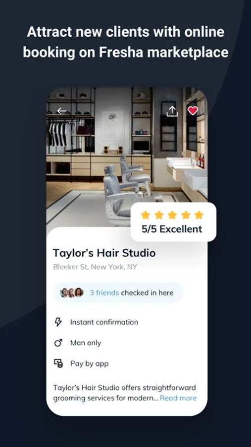• Attract new clients online and be discovered 24/7 with a business profile on Fresha marketplace