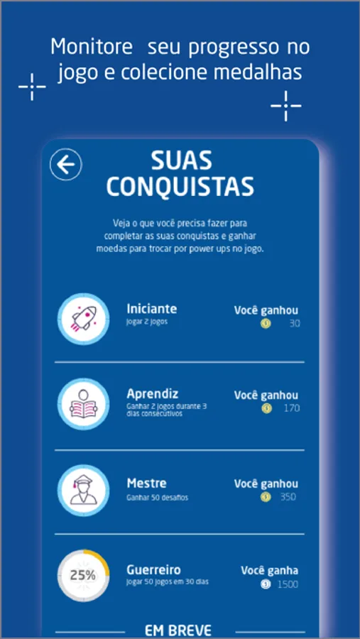 A cada desafio você pode ganhar diferentes tipos de recompensa - pontos, que podem garantir a liderança no ranking geral ou por tópicos de conhecimentos. Ganhe moedas e troque por power-ups (poderes extras) como tempo extra, pontuação dupla, entre outros, que vão ajudar em sua estratégia de evolução para conquistar a liderança.