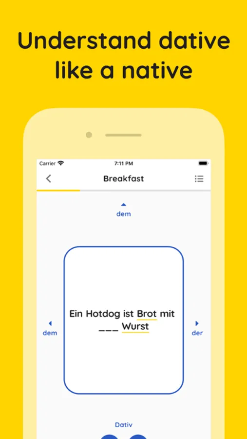 Enter Grammapp. Probably the fastest (and most delightful) way to learn German grammar and build your vocabulary. Set aside the daunting word tables and jargon. Start swiping your way to perfect German grammar, one card at a time.