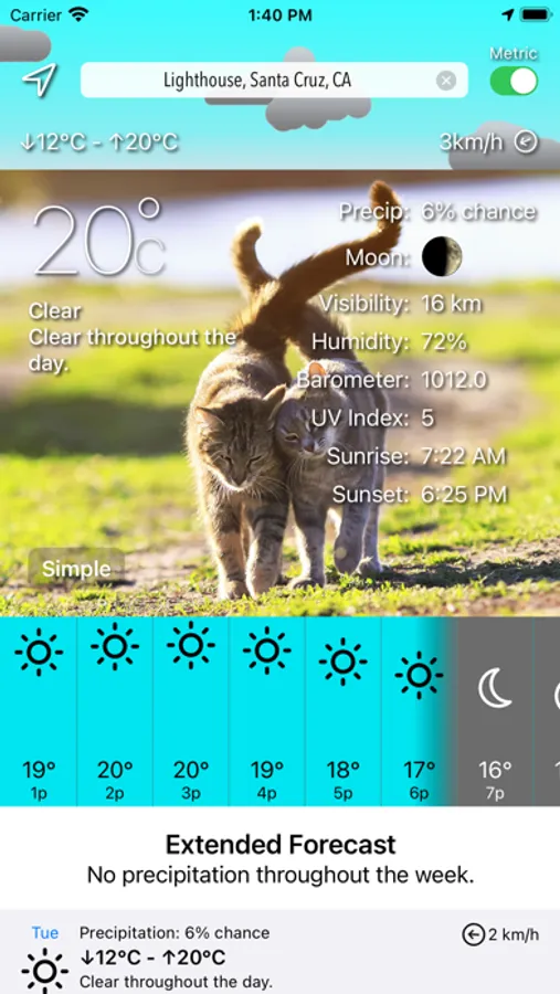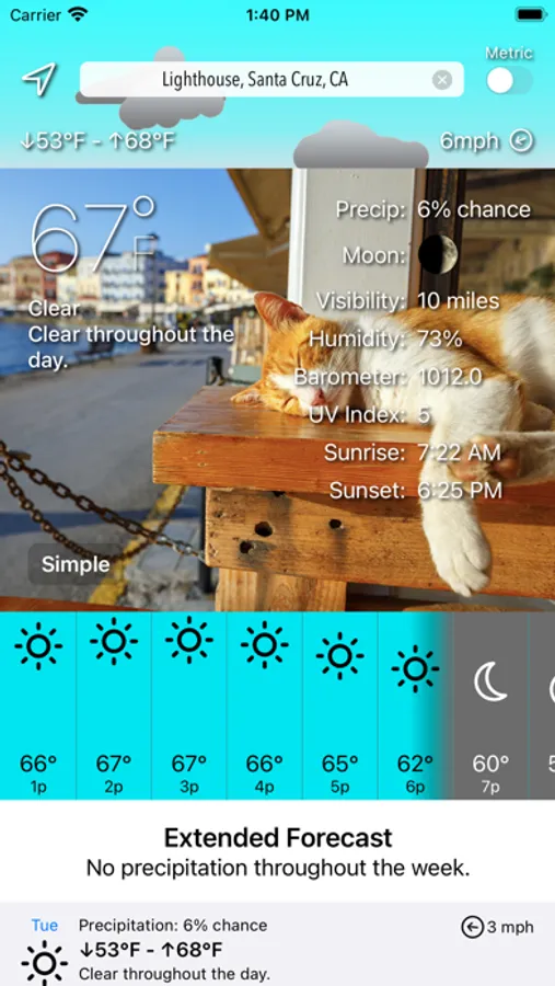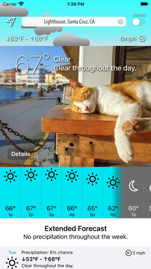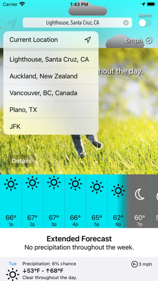 • Tap the location arrow to see accurate weather for your current location, along with a seven day forecast.