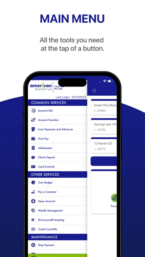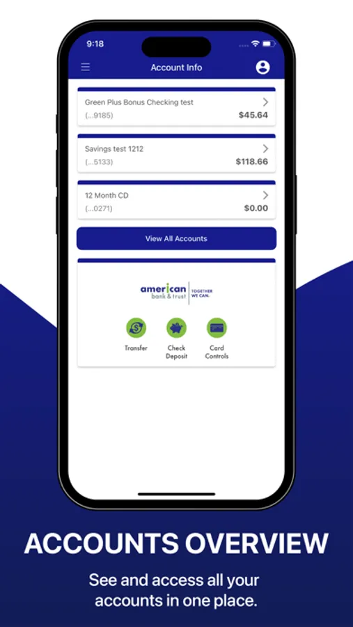 Conduct banking anytime, anywhere with the American Bank & Trust iCan app. Check balances, make transfers, pay bills, and much more, all from inside the app! Need to contact us? Click the Contact Us icon on the login screen of our app.