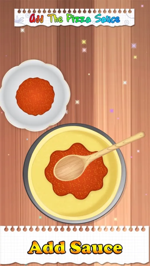 Now let's add the pizza sauce. Use the spoon to scoop and add the sauce onto the pizza dough.