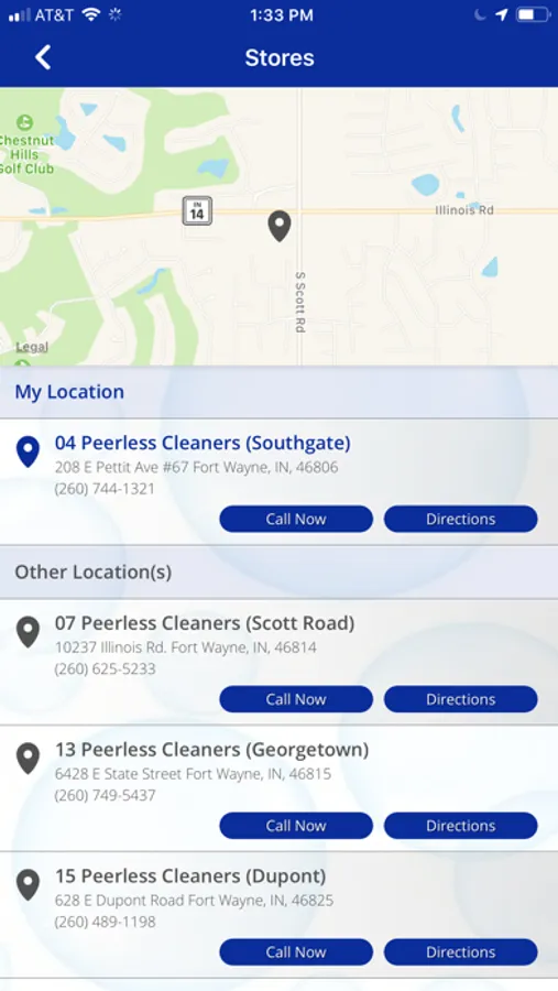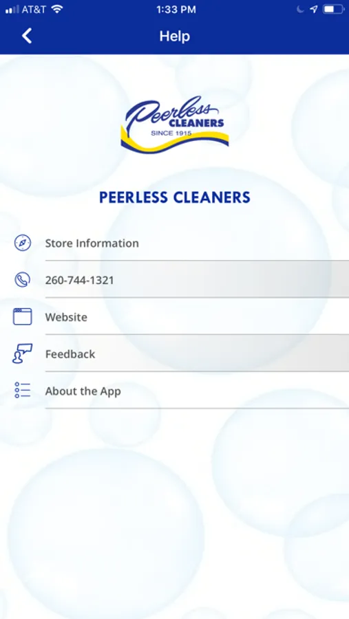 5) Quickly contact Peerless Cleaners by phone or email and access their website all directly from your device.