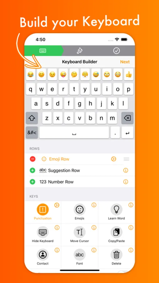Use the keyboard builder for creating a fully customized keyboard layout in less than a minute. Your own keyboard layout is called “My Keyboard” and can be configured in every imaginable way. You can even add a copy, cut or paste key, a font key, an emoji key, a move cursor key, a “delete all” key and so much more. You can also create your own keys, for example for inserting copypasta or using copy/paste keys to perform these actions faster.