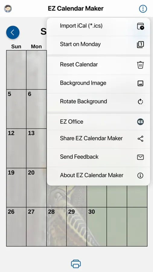 EZ Calendar Maker is a free handy utility for creating and printing clean looking calendars from any device. It is designed to be as easy to use as possible. You can select the month you want to print and do some customization, such as adding a background image to the calendar. Then you simply hit print and a new calendar will come out of your printer! Free and easy to use, EZ Calendar Maker sure beats buying a new calendar from the store every year.