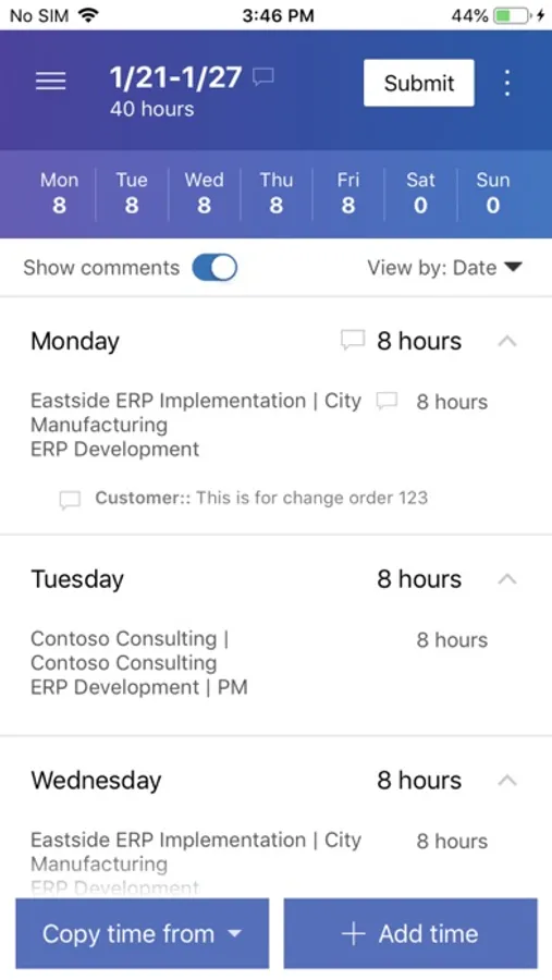 The Microsoft Dynamics 365 Project Timesheet mobile app enables users to submit and approve timesheets for projects. This mobile app surfaces the timesheet functionality that resides in the project management and accounting area of Dynamics 365 for Finance and Operations, improving user productivity and efficiency as well as enabling timely entry and approval of project timesheets.