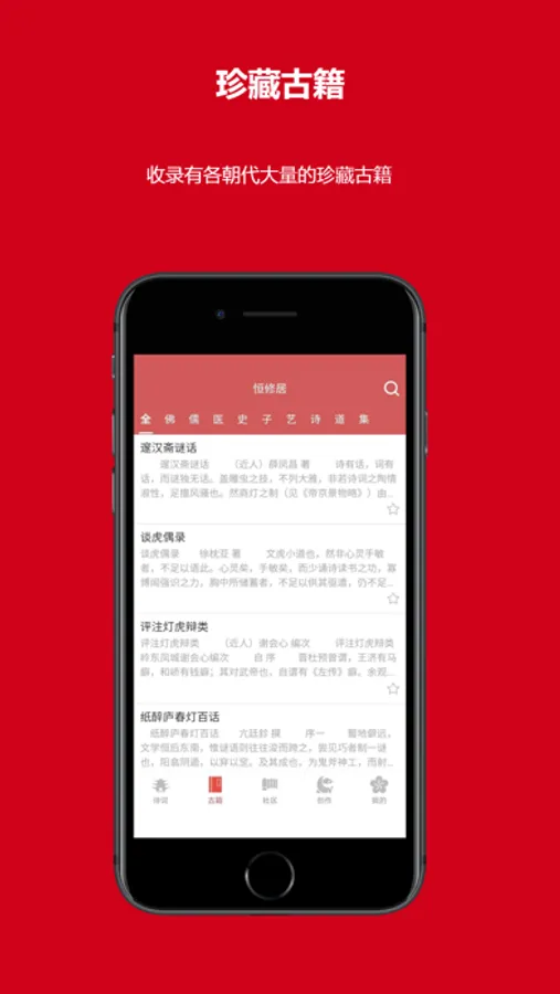简介:恒修居国学探索国学魅力,弘扬民族传统文化。恒修居国学收藏了数万部国学经典著作,包含古籍、古诗、古词等诸多的国学古文经典。在领 略古诗词魅力之余,还可查看作者简介,诗词解析,创作背景等。
