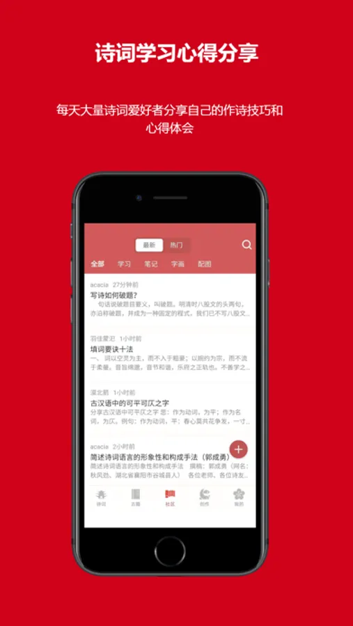 5、诗词社区:诗友在这里可以分享自己的作诗技巧和心得体会,和其他诗友一起学习进步