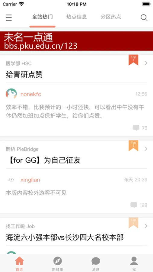 北大未名BBS,域名为bbs.pku.edu.cn,是北京大学正式BBS,主要为北京大学师生与校友提供互联网电子公告牌(Bulletin Board System)服务。北大未名BBS移动端应用集成读贴、回帖、站内信、消息、新鲜事、站内热门等功能,为未名用户提供良好的移动端体验。版本功能: