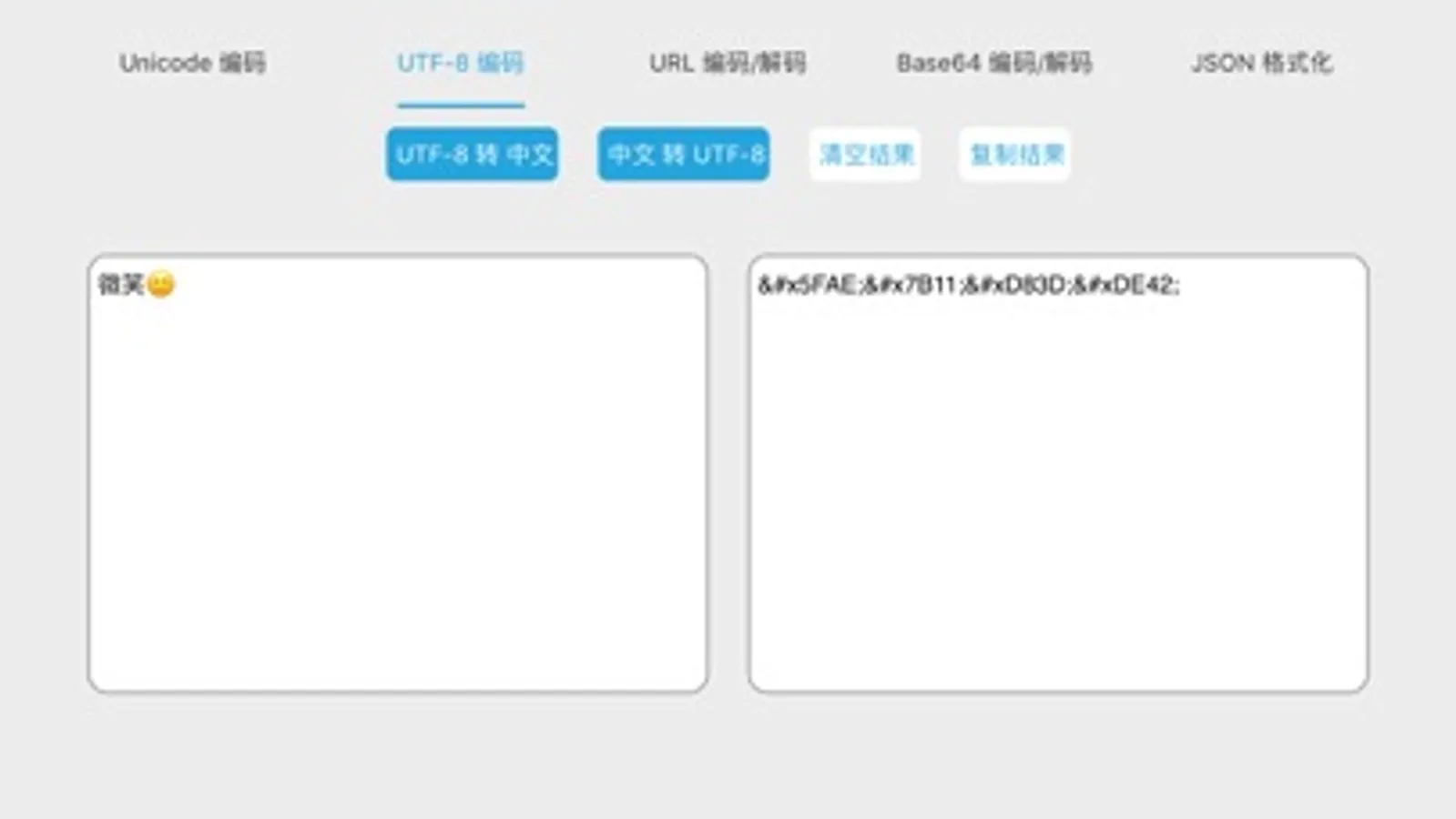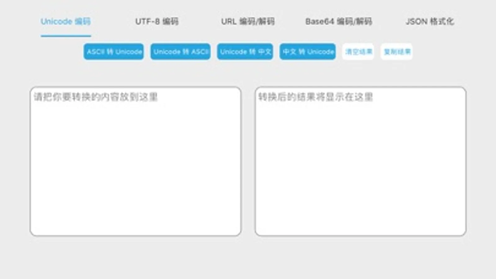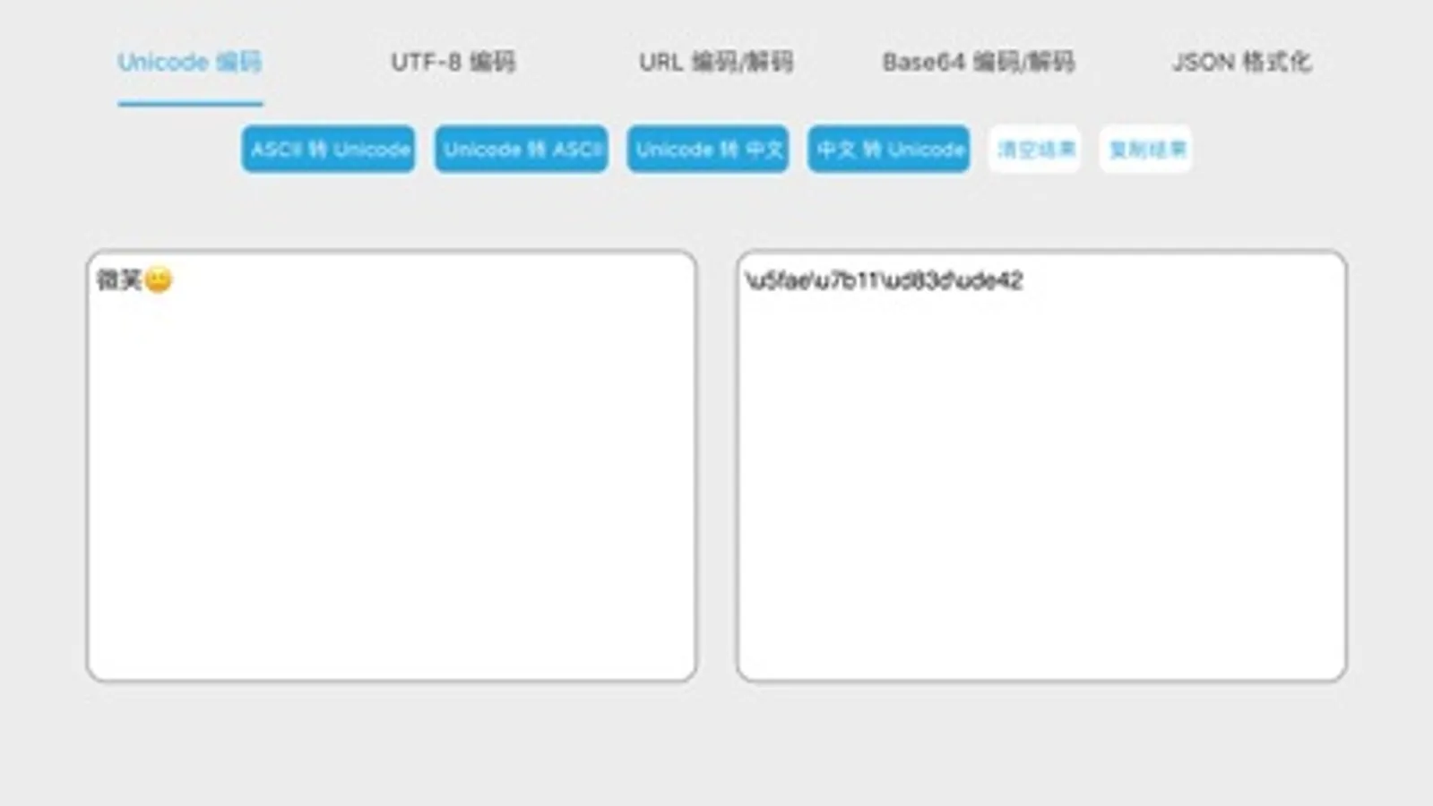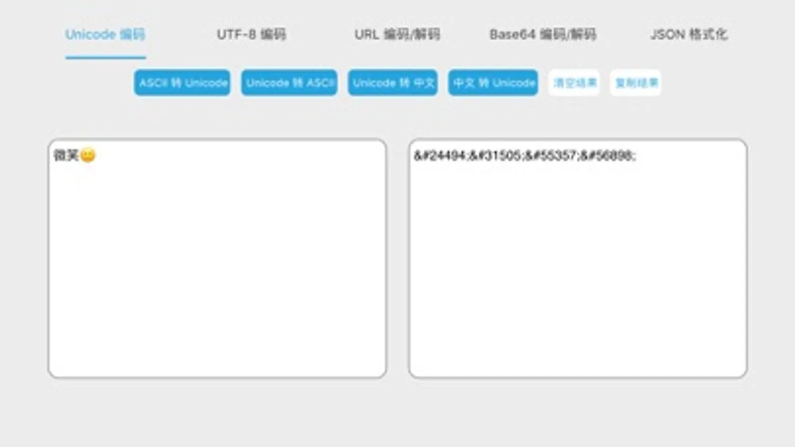 这是一个编码转换的工具,集Unicode与ASCII互转、Unicode与中文互转、中文与UTF-8互转、URL编码解码、Base64编码解码、JSON格式化、表情转码于一体,让你体验不一样的移动转码。
