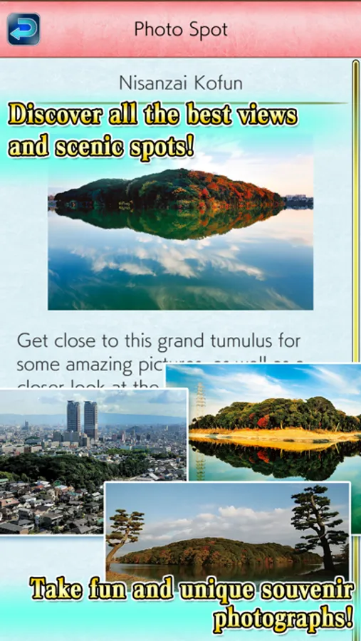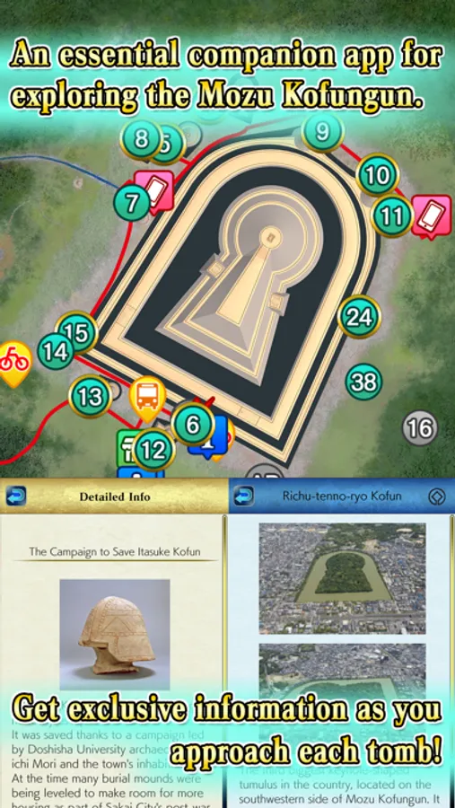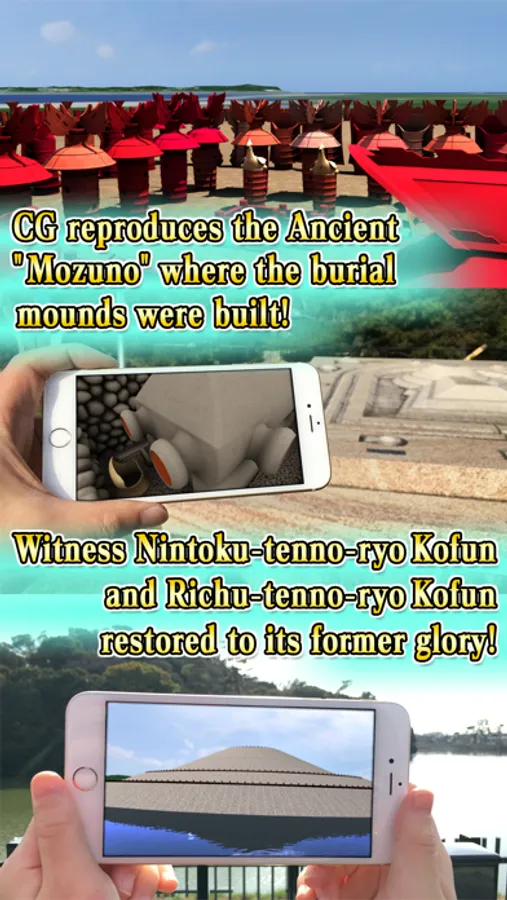 High resolution CG reconstructs the scene of the ancient "Mozuno" where the "Nintoku-tenno-ryo Kofun" which is one of the world's largest tombs and the "Richu-tenno-ryo Kofun" of the third largest burial mound in the country was built. See the tombs as they were when they were first built over 1,500 years ago, with a full 360° view. Also features AR functions based on the latest archaeological research to bring the lives and times of the ancient inhabitants of this region to life.