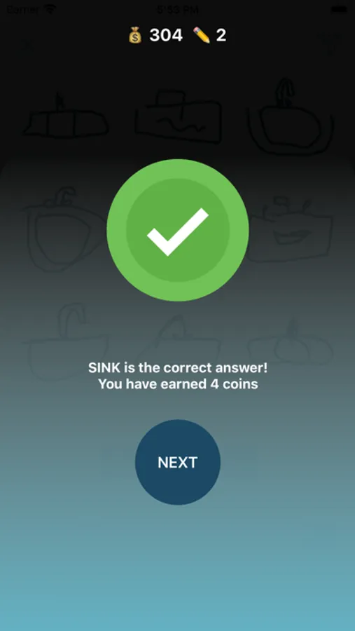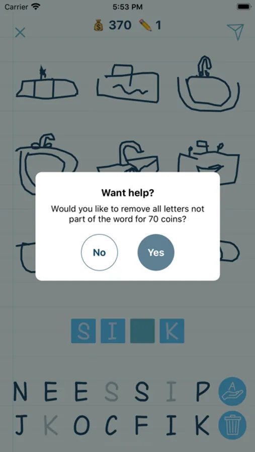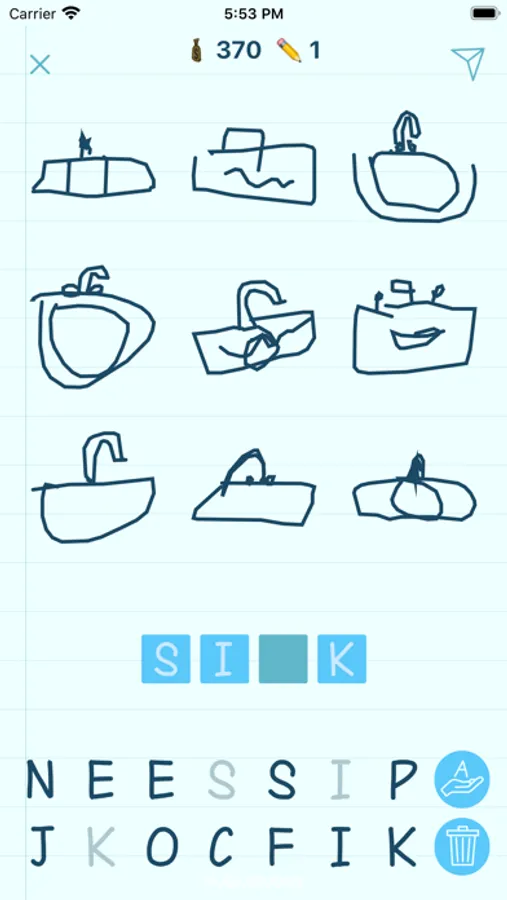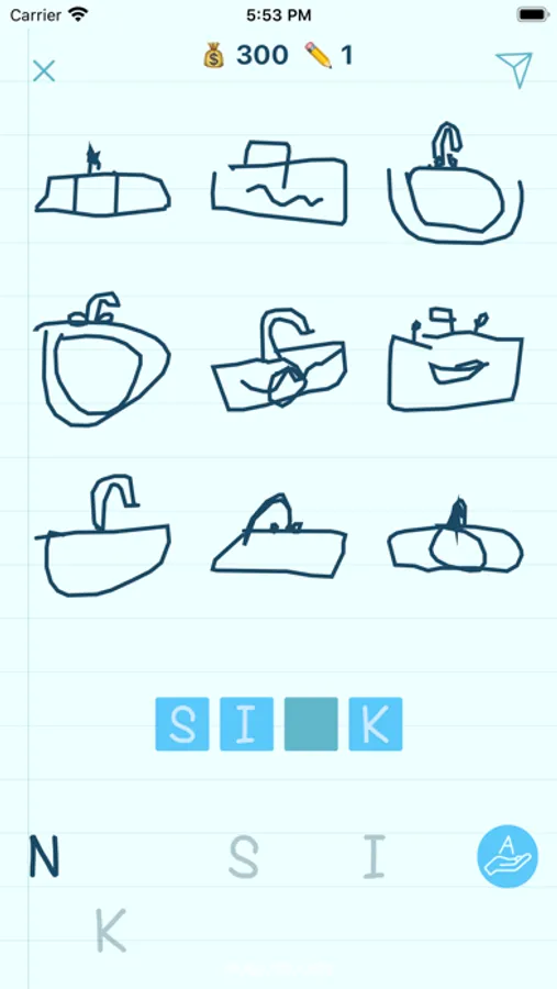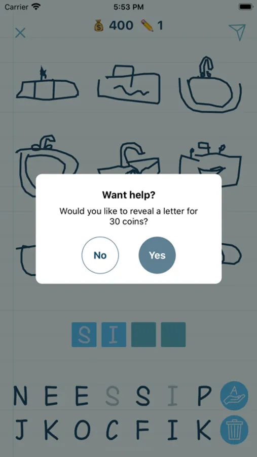 Given real human recorded drawing you are tasked with deciphering the drawn object given all the available letters of the thing, and some extra. The quicker you answer the more bonus coins you get, and you'll need those coins for hints!