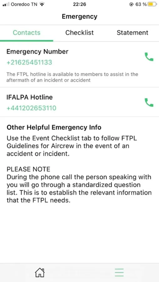 Emergency - Members can contact FTPL by telephone or SMS in the event of an emergency, and follow guidelines for aircrew in a step-by-step process.