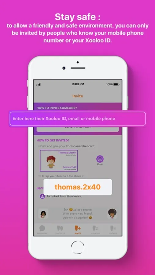 - Stay safe: To allow a friendly and safer environment, you can only be invited by people who know your mobile phone number, your email or your Xooloo ID.