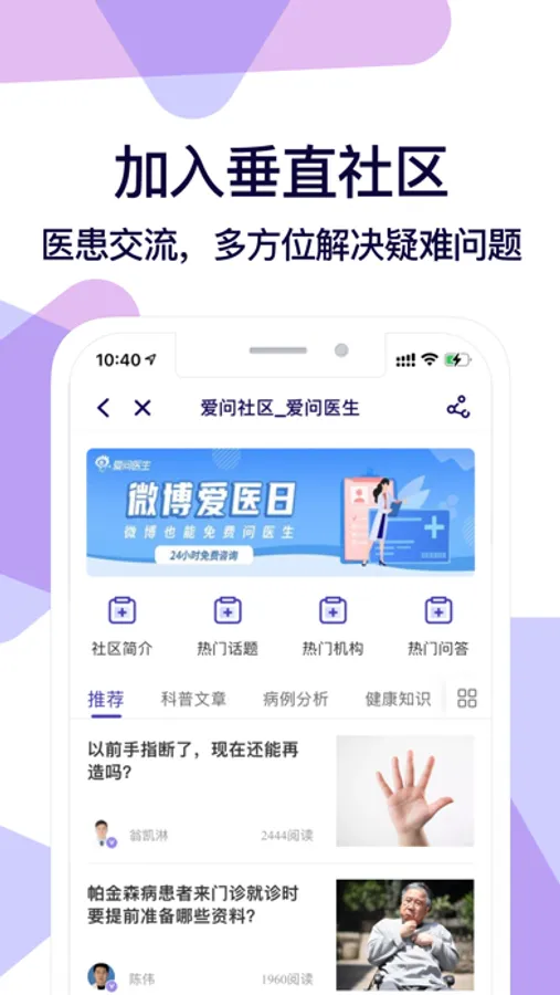 爱问健康,新浪健康在线咨询预约医生社区,国内顶尖互联网健康平台,汇集了近10万微博健康大V及爱问健康认证团队,累计服务2000万+患者。服务包括:健康问诊、公益活动、健康科普、专家访谈等。分别有内科、外科、儿科、皮肤科、口腔科等25+科室分类,是中国互联网健康的引领者,旨在让健康问诊变得更便利。