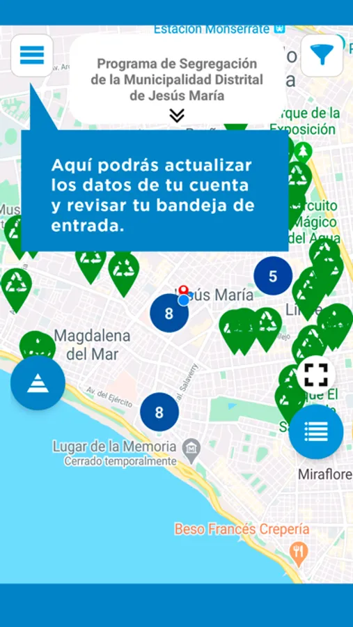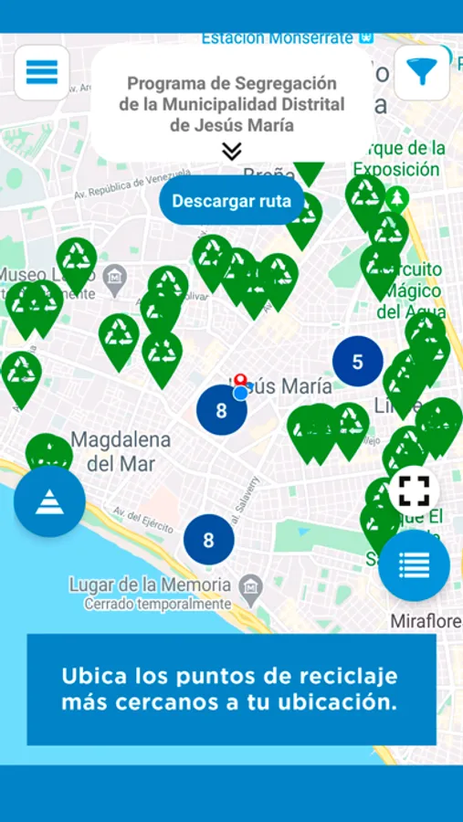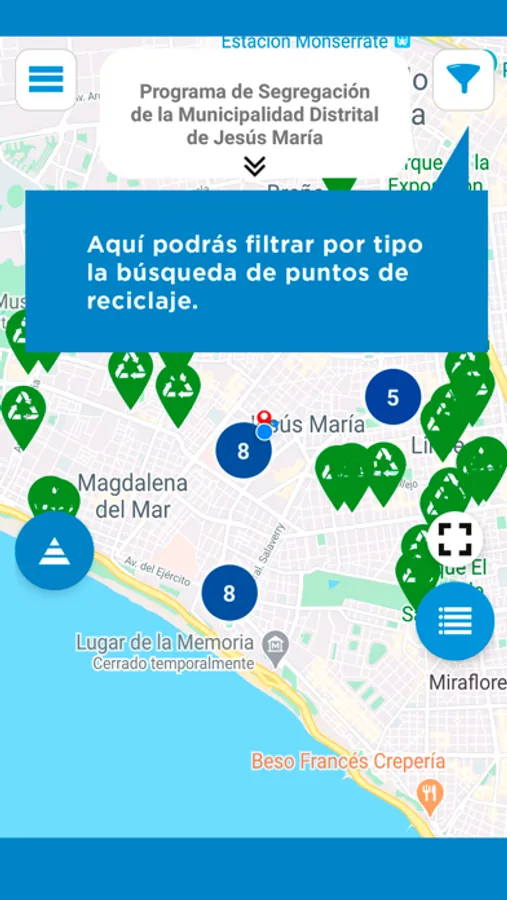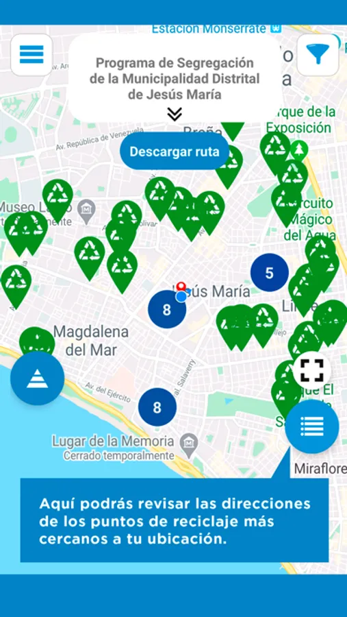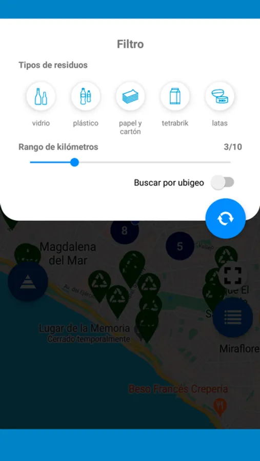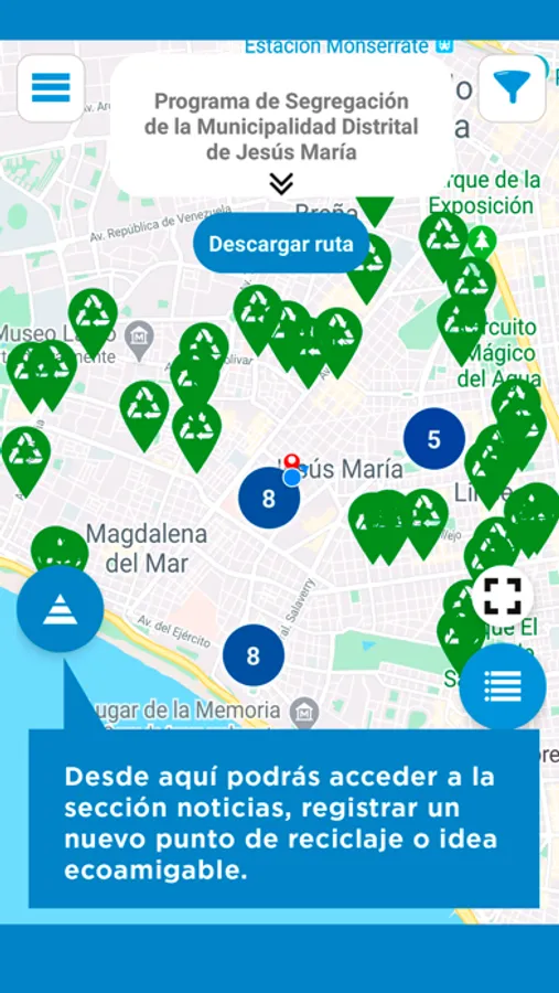 A través del aplicativo se accede a las ubicaciones de los puntos de reciclaje de vidrio, plástico, papel, cartón, tetrabrick, latas, pilas, celulares, equipos de cómputo y electrodomésticos a nivel nacional, o los programas de las Municipalidades que realizan la recoleccion selectiva de estos residuos.