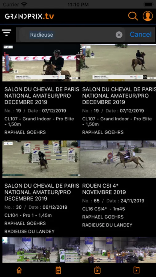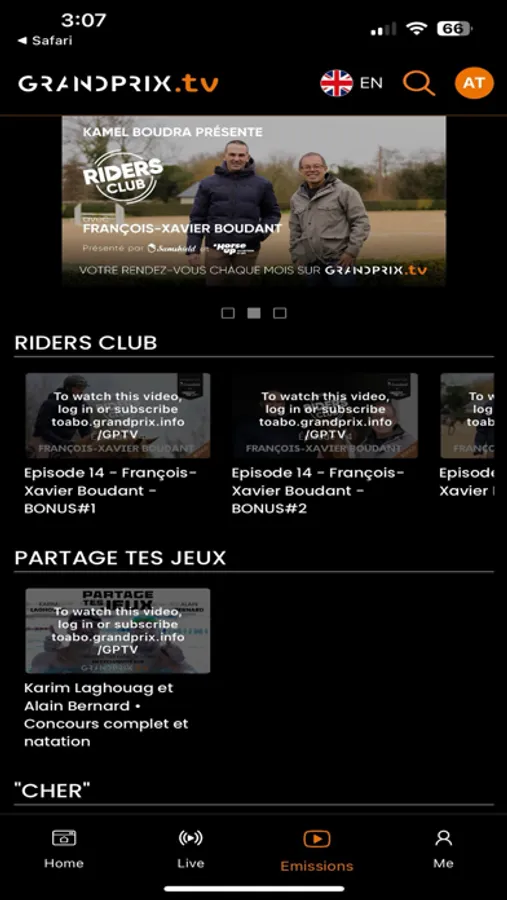 GRANDPRIX.tv vous offre un accès exclusif à plus de 3,8 millions de parcours sportifs et diffuse en direct plus de 350 événements équestres par an. Découvrez également nos émissions : plongez dans l'intimité des plus grands cavaliers du monde avec « RIDERS CLUB » présenté par Kamel Boudra, ou regardez encore « Cher » et les MasterClass.